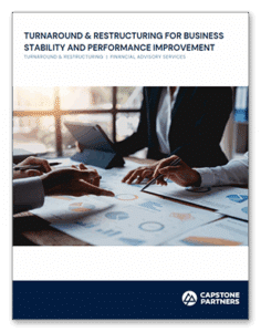 Capstone Partners released its white paper discussing Turnaround & Restructuring solutions for business stability and performance improvement. Financial distress and operating disruptions are often shared experiences by business owners across all industries; Capstone’s Financial Advisory Services (FAS) group can offer stakeholders a range of turnaround and restructuring advisory services designed to stabilize a troubled company’s position and to help it preserve value and return to sustained growth. When a business becomes distressed, rapid changes require quick and decisive action. In such instances, it is vital to have a knowledgeable and experienced team to help assess the root causes of the distress and implement immediate solutions. This paper will equip stakeholders with information needed to help discern what services are available and when to engage a Turnaround & Restructuring professional.